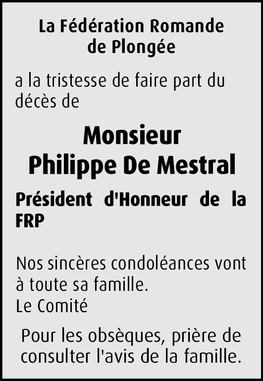 J'ai combattu le bon combat, j'ai gardé la foi; désormais la couronne de gloire m'est réservée, dit l'apôtre Paul. Pour Philippe De Mestral, c'est fait, c'est arraché avec brio, dit le témoin vivant et oculaire de la démonstration de la foi, de l'amour du Christ vécu, bref de l'Evangile tout court. Ma vie à ses côtés ne peut qu'être témoin, tel un disciple assidu, de ce pionnier de la foi, humble, désintéressé, aimant et aimable, hospitalier à tout bord, tolérant à la limite de la naïveté, bref un vrai phénomène de la foi. Que sa main reste tendue à jamais sur sa famille, de la même manière qu'il la tendait, de son vivant, à toute brebis du Seigneur, saine ou galeuse. Que sa bénédiction et son exemple,et que la grâce et la miséricorde de Dieu, notre Père envers qui nous sommes redevables en toutes choses s'étendent sur les siens, bien aimés dont:- Etienne, Laurent, Charles, Bertrand, Pierre, Christine... De Mestral. A vous, comme à ma famille en Belgique ainsi qu'aux Mbidi, celui qui persévérera dans la foi et l'amour à l'enseigne de Philippe De Mestral, sera sauvé, car c'est là notre vraie destinée. Vives consolations dans le Christ, notre rédempteur.