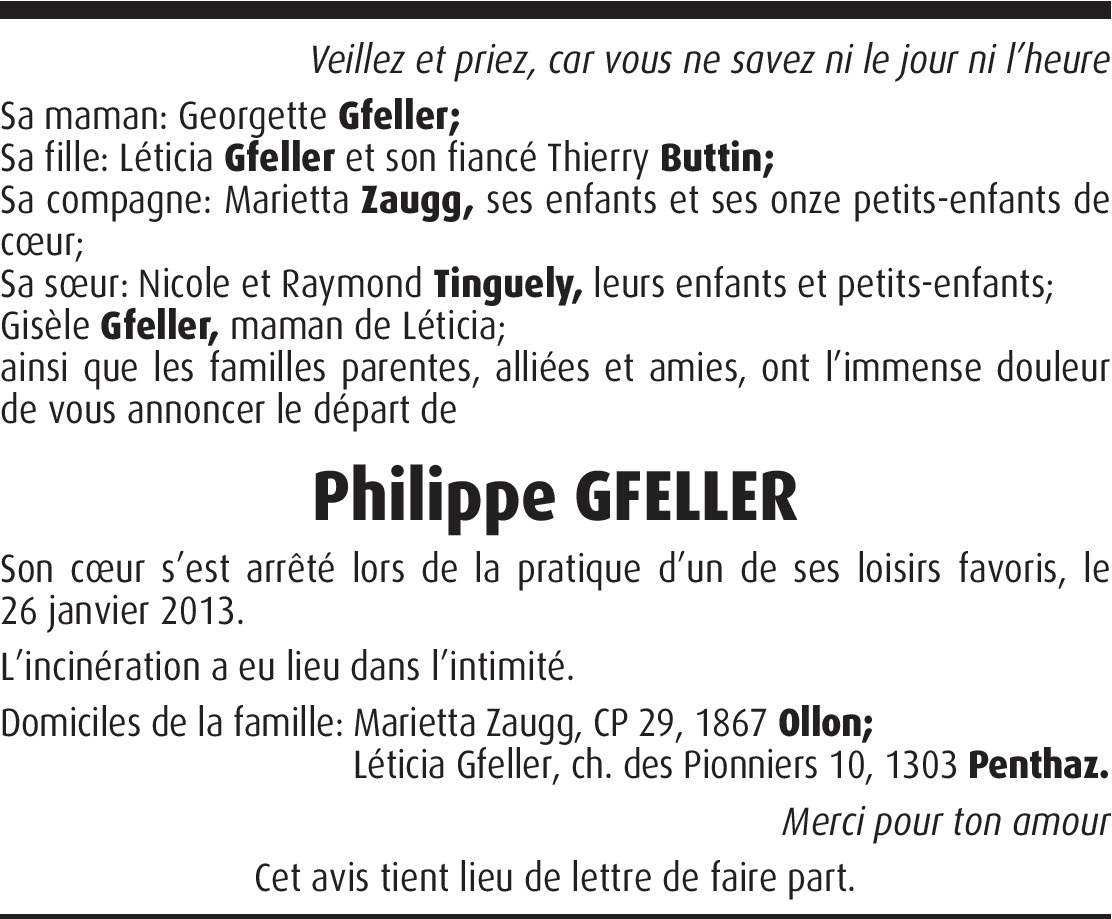 Chère Léticia. Je viens prendre connaissance de la triste nouvelle. A cet égard, je te présente mes sincères condoléances et beaucoup de courage. J'ose espérer que Laura a vu l'avis et pendra contact avec toi. Merci de saluer ta Maman. Bien à toi. Patrick