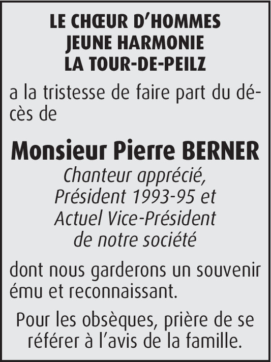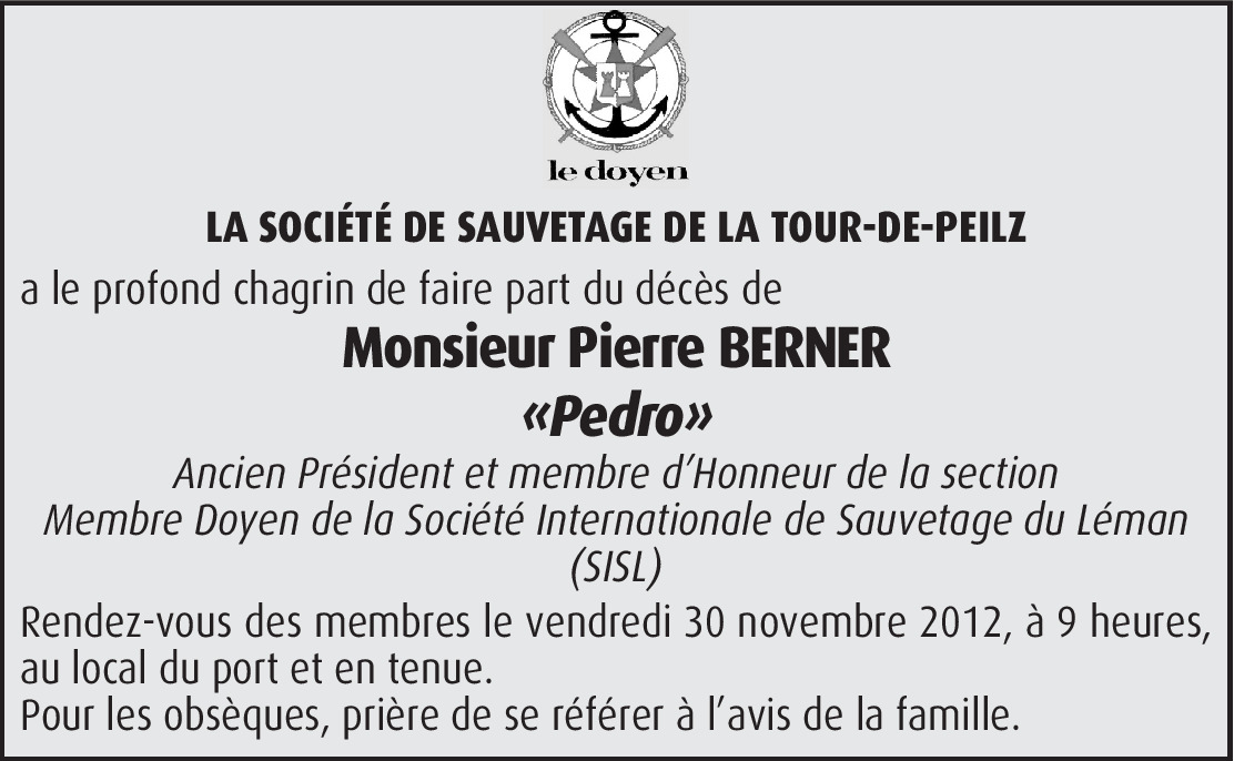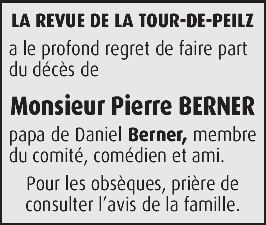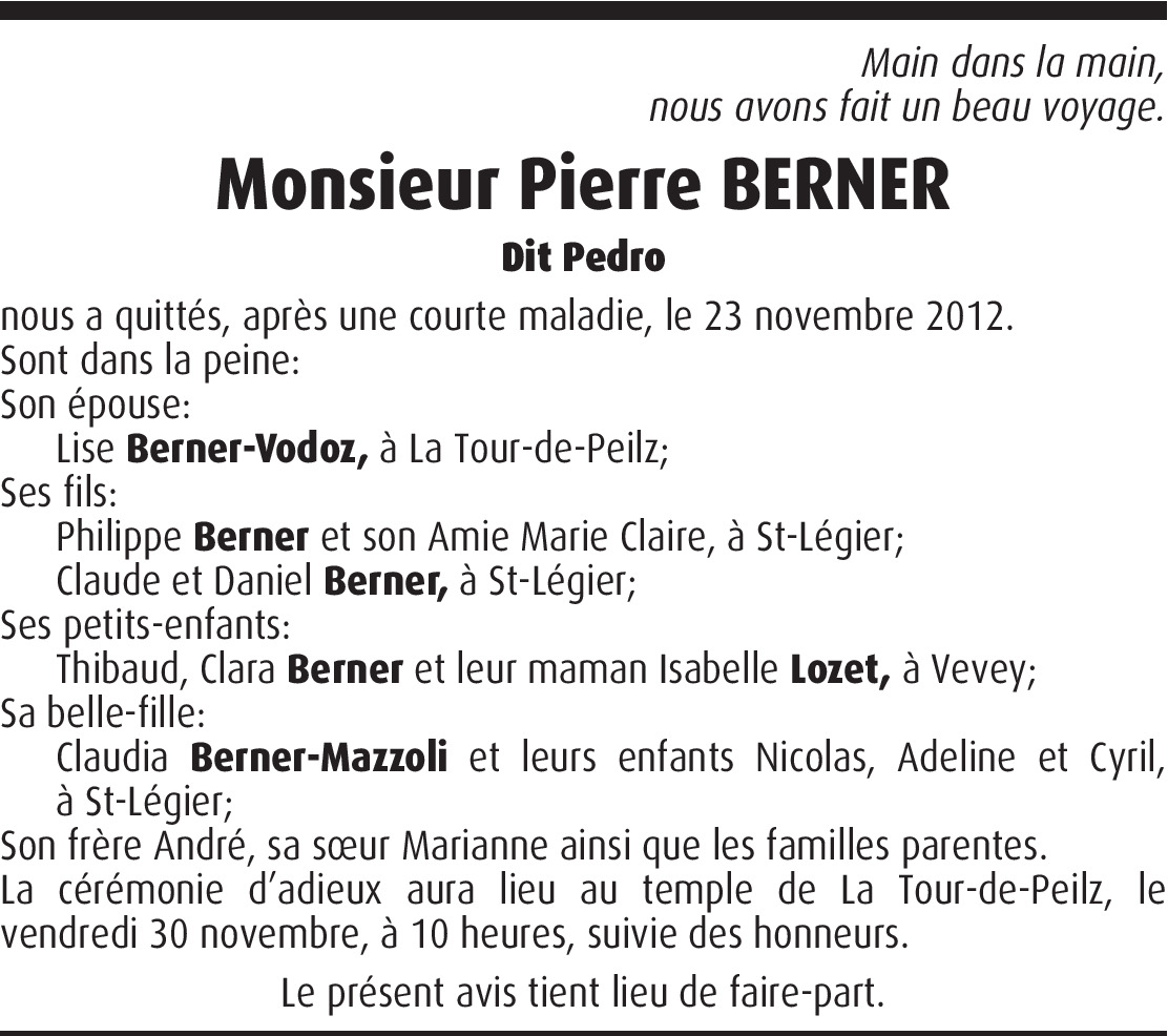 Il y a plus de 4 ans Signaler A vous chère famille Berner recevez toute mes amitiés, en ce moment douloureux, ainsi amitié de mes parentes Alexis et Annie Chevalley qui sont à l'étranger actuellement. Didier Chevalley. De la part de Didier Chevalley
