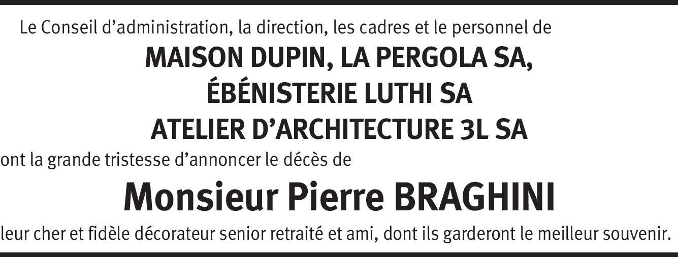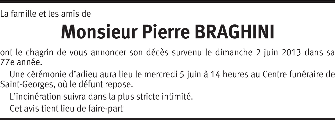 Je suis touché par ce décès car M. Braghini était dans la même unité que ma mère. Avec toute ma sympathie.