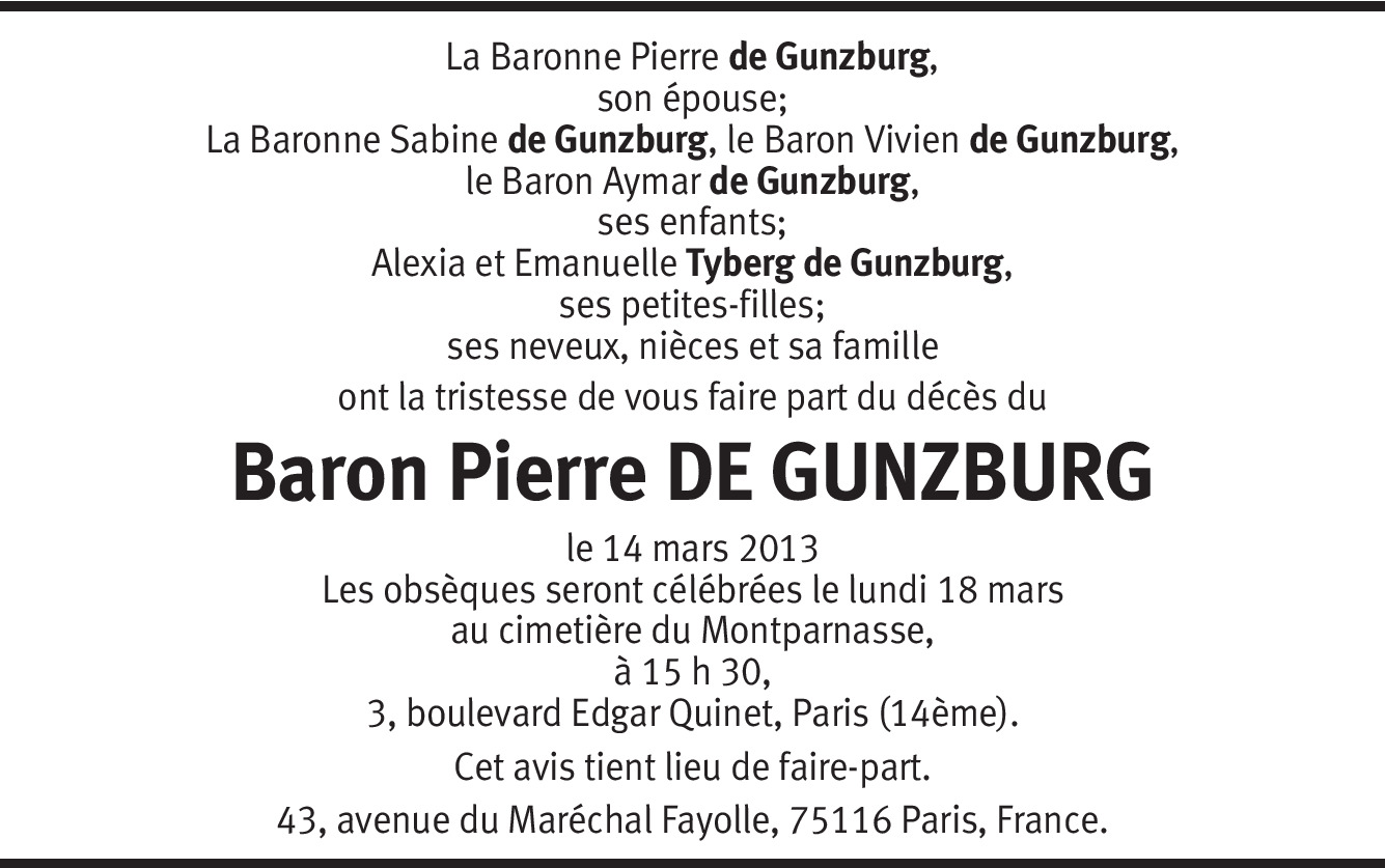 Le tristesse m'envahie à la lecture fortuite de cette nouvelle, j'ai travaillé avec Monsieur de Gunzburg entre 1970 et 1977, j'étais sa secrétaire et en tant que telle nous passions beaucoup de temps ensemble il aimait à dire que son père avait passé 40 avec sa secrétaire, moi j'ai poursuivi ma vie ailleurs mais depuis tout ce temps je n'ai jamais oublié quel patron agréable il était humain, proche, il était là pour mon mariage, nous étions là pour le sien avec mon mari et cela nous avait beaucoup touchés qu'il nous invite. Je me suis occupée de Sabine lorsqu'elle était très jeune, parfois il nous arrivait d'aller au cinéma, bref c'était pour moi plus que simplement "mon patron". Veuillez croire en mes très sincères condoléances, je garderai son souvenir précieusement.