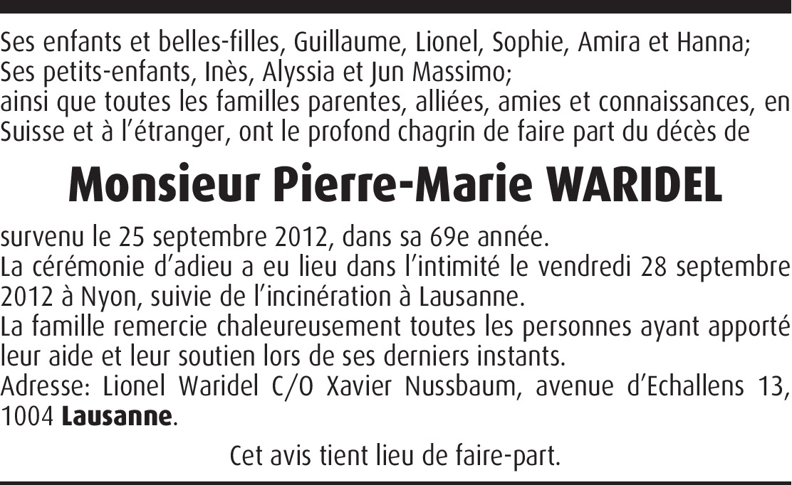 Toutes mes condoléances à la famille de Pierre-Marie. En souvenir de toutes ces années durant lesquelles nous nous sommes côtoyés professionnellement de façon toujours très agréable.