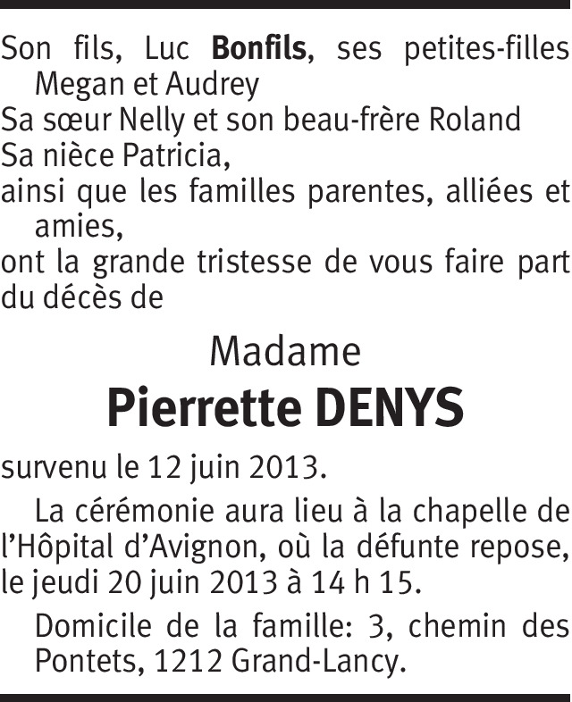 Helvetia, Amicale des Suisses Vaucluse-Gard a le profond regret d'annoncer le décès de Pierrette Denys, membre active de notre association. Nous adressons à son fils Luc, à sa famille, amies et amis nos sincères condoléances. Raymond Cart, Président.