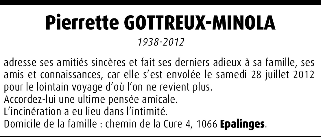 Je suis une cousine germaine de Pierrette que je n'ai jamais rencontré. Je suis née en 1954, mon père Jean Minola l'oncle de Pierrette est décedé en 1963. J'ai gardé des contacts avec Guiliana et son frére Rinaldo. Je suis désolée de ne pas l'avoir rencontré. J'habite en France en Isère. Recevez mes sincères condoléances.