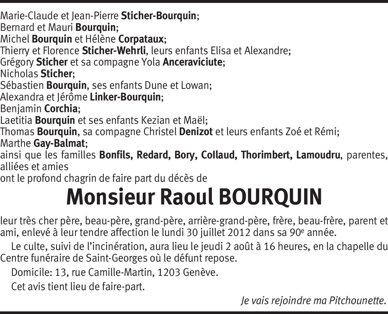 C'est avec une très grande tristesse que nous avons appris, ce midi, le décès de Raoul, comme il nous manque déjà, son sourire, sa gentillesse à l'égard de ma maman, je suis bien en pensée avec vous et nous serons là jeudi pour lui dire un dernier adieu. Amitiés Sylvie