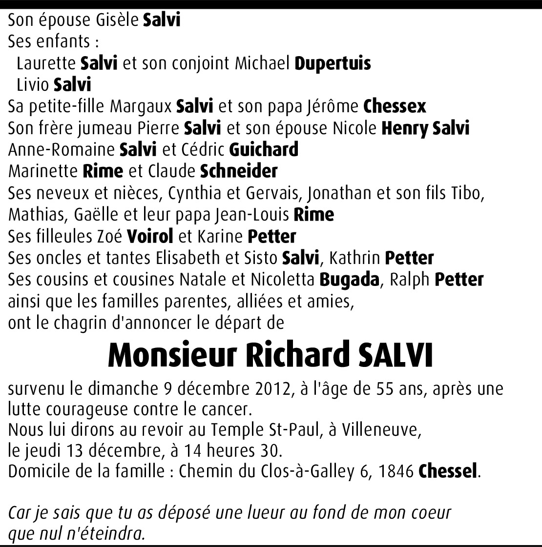 Il y a plus de 4 ans Signaler Toute ma sympathie vous accompagne dans cette douloureuse épreuve. Sincères condoléances. De la part de Virginie Monnard