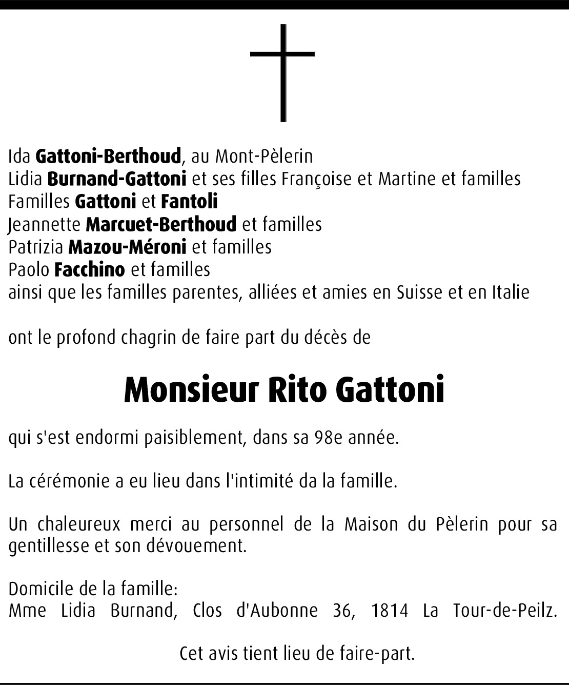 Chère famille, j'ai connu M. Gattoni lorsque j'étais en apprentissage de 1969 à 1972 à la Cipag à Vevey où il était directeur. Je garderai un merveilleux souvenir de M. Gattoni qui était toujours charmant et sympathique et avec qui j'échangeais toujours quelques mots en italien. Avec mes sincères condoléances.