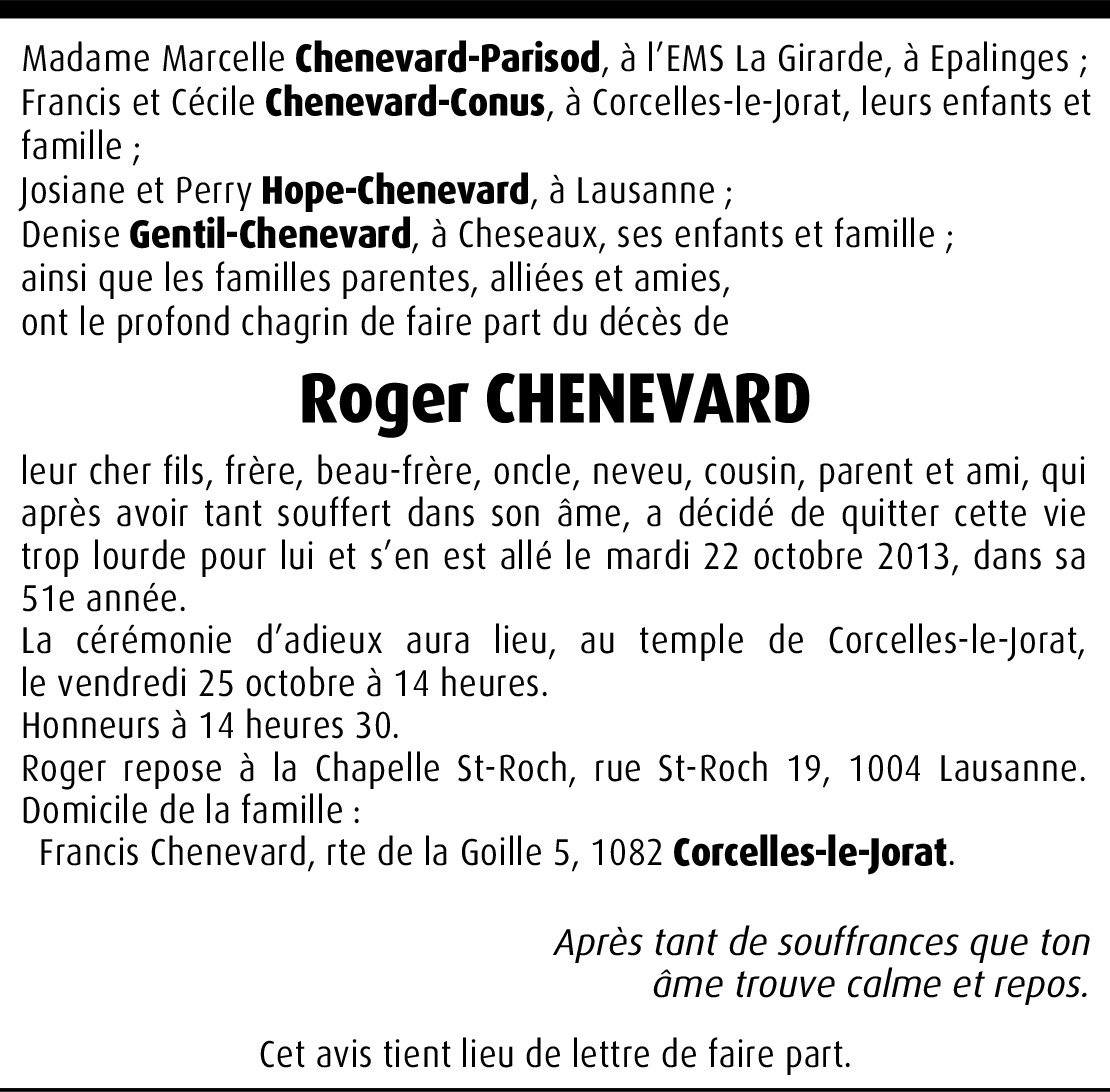 Il y a plus de 4 ans Signaler Chère Famille, C'est avec tristesse que j'ai appris la nouvelle. Je suis en pensée avec vous et je vous présente mes sincères condoléances. De la part de Jean-François Chappuis