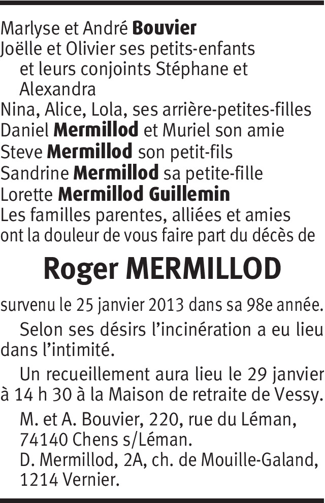 Il y a plus de 4 ans Signaler Par ce message je viens remercier toutes les personnes soit par leur présence ou par écrit lors du décès de mon papa. Daniel et famille. De la part de Daniel Mermillod