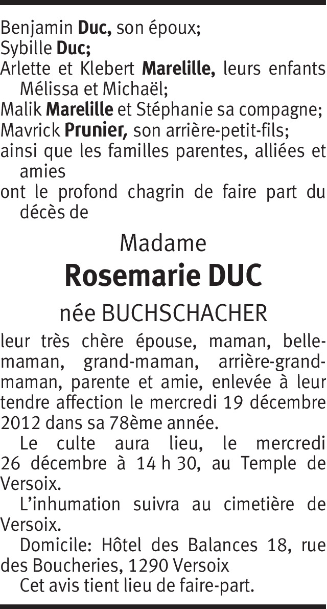 Il y a plus de 4 ans Signaler Nous venons d'apprendre le décès de Mme Duc nous vous présentons nos sincères condoléances. Famille Fuchs anciennement Le National. De la part de Pierrette Fuchs