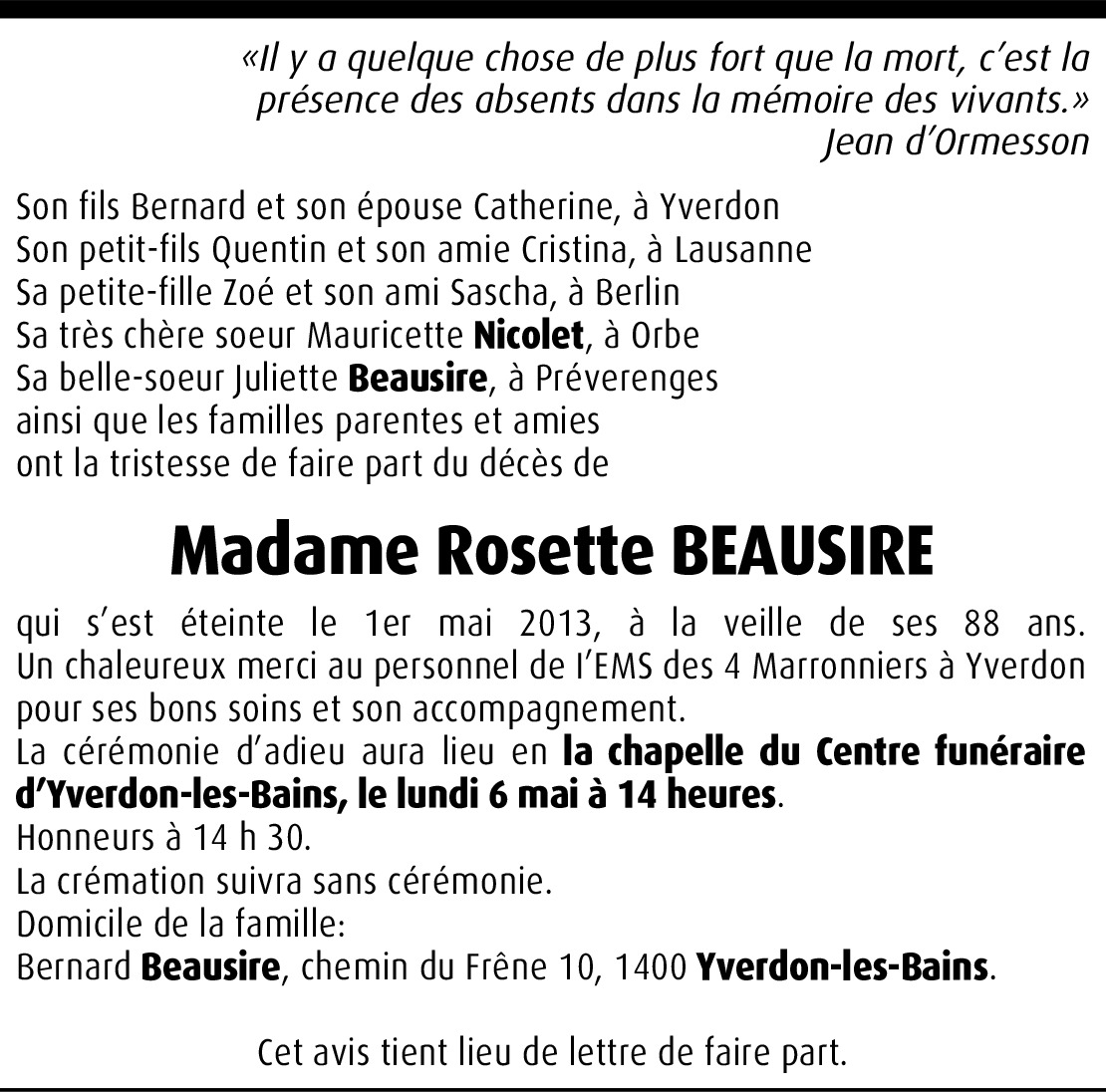 Il y a plus de 4 ans Signaler Chère Famille, c'est avec une grande tristesse que nous apprenons le décès de Rosette, amie , contemporaine et collègue de travail, nous garderons d'elle un souvenir radieux, et pensons très fort à Mauricette. maryse et mélida De la part de Maryse Gilgien