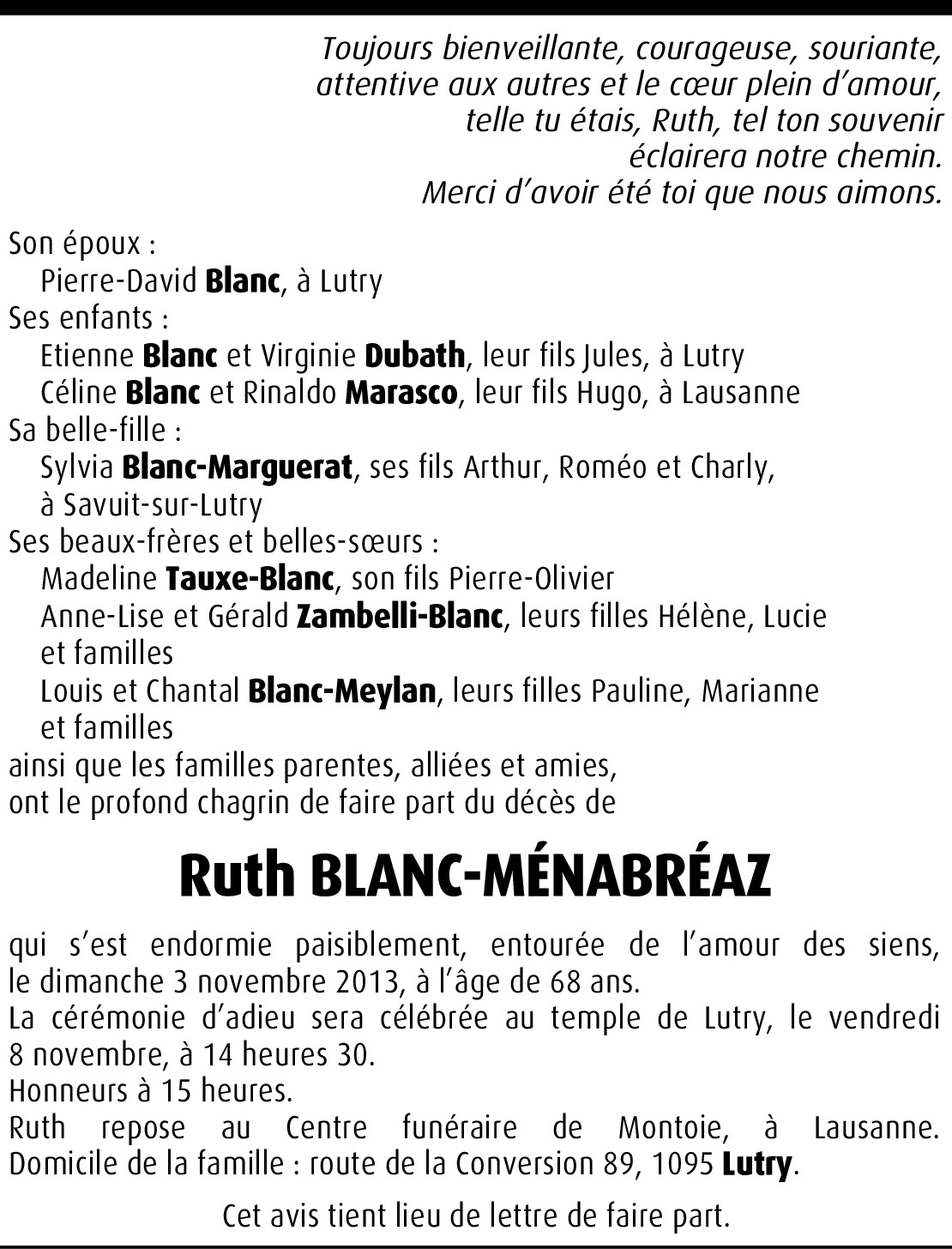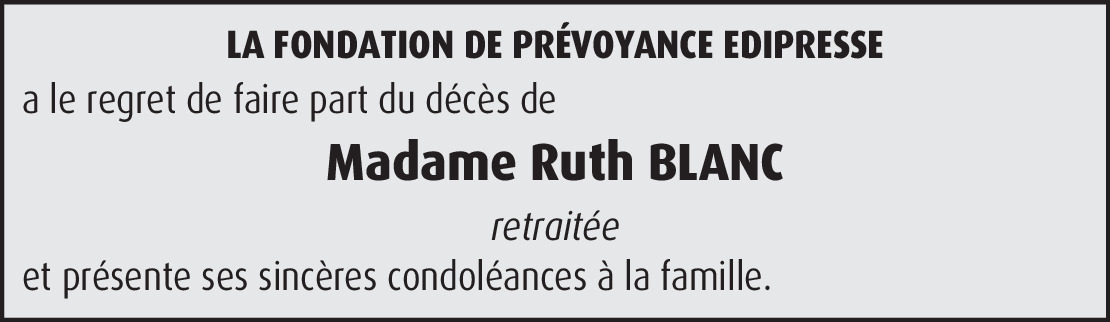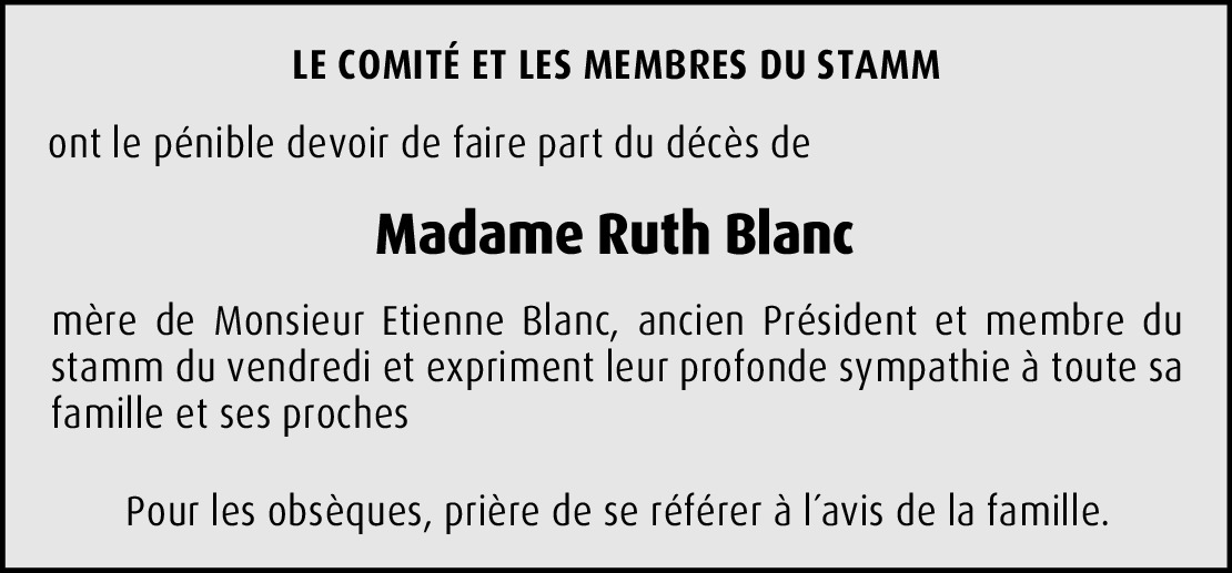 J'ai appris le dècès de Ruth ce matin et cela me fait beaucoup de peine. De la peine pour ses proches qui ont déjà subi la perte de Pierre-François, emporté si jeune. Ruth, je n'oublierai pas ton dynamisme, ton rayonnement et nos années de travail communes à la base info. A vous: Pierre-David, Etienne, Céline, Sylvia et ses chers petits-enfants, mes condoléances les plus sincères. En pensées avec vous, de tout coeur.