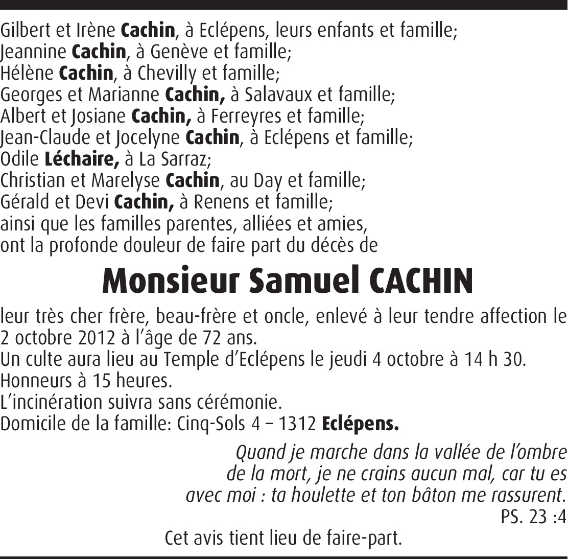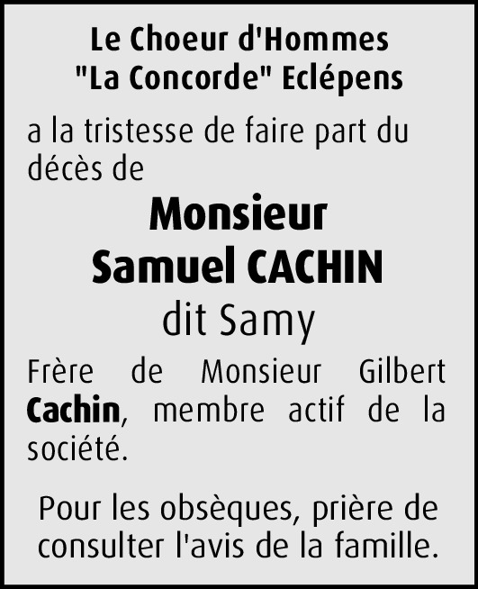 Je transmets mes condolèances à la famille de Monsieur Gilbert Cachin et Irène. "Salut Samy!" Hofstetter Jean-Jacques et famille. (Ex chauffeur HM.SA./Eclépens-Gare)