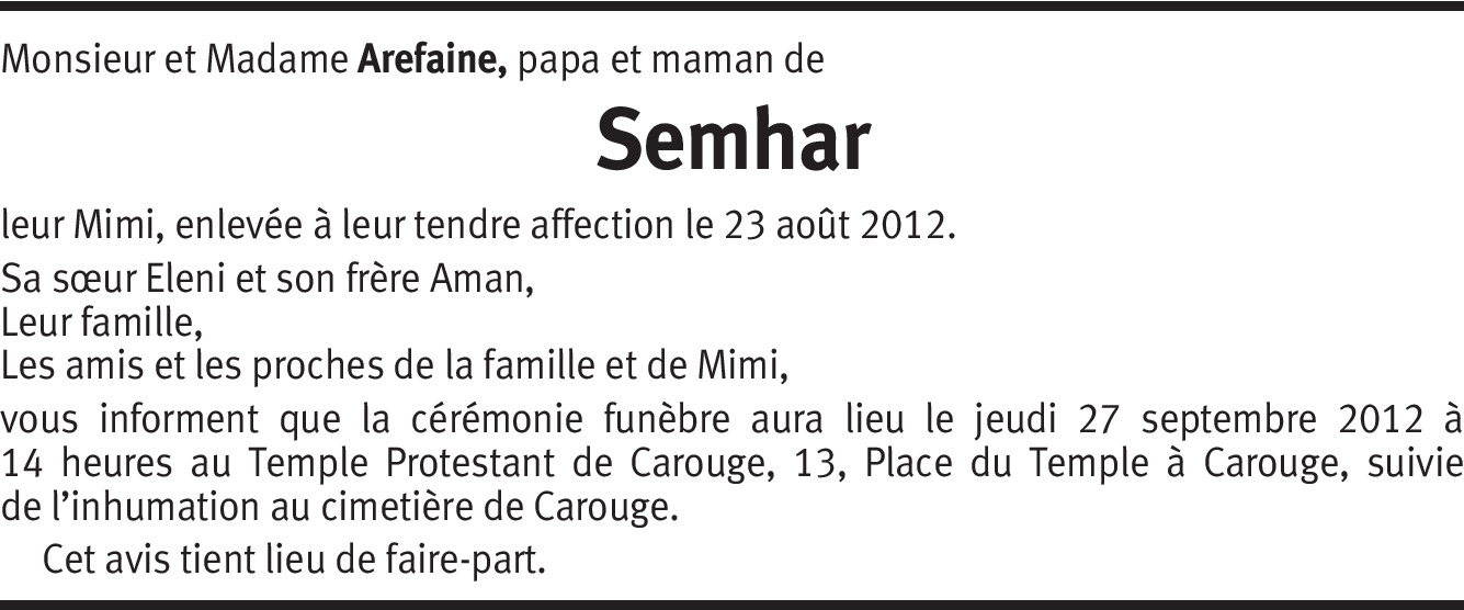 Semhar puisses enfin trouver le repos éternel et prendre ton envol vers le paradis! Tu mérites au moins ça!!! Petit ange à qui on a enlevé brutalement la vie... Veille sur ta grande soeur Eleni, ton petit frère Aman ainsi que ta maman et ton papa qui vont avoir besoin de beaucoup de courage pour pouvoir continuer d'avancer dans la vie sans toi à leur côté... Une étoile va briller plus fort dans le ciel et cette étoile se