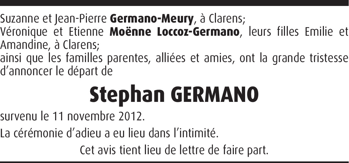 « IL aurait aimé vous dire quelque chose...REGRETTEZ MON ABSENCE... MAIS LAISSE-MOI PARTIR. Lorsque j'ai atteint la fin du voyage et que le soleil pour moi s'est couché je ne veux pas d'un rituel sombre et funèbre. Pourquoi pleurer une âme libérée ? REGRETTEZ MON ABSENCE UN PEU... MAIS PAS TROP LONGTEMPS. Et ne laisse pas la souffrance t'accabler. Souviens-toi de l'amour que nous avons partagé. REGRETTEZ MON ABSENCE... MAIS LAISSE-MOI PARTIR. Car c'est un voyage que tous nous devons faire et que chacun doit accomplir en solitaire. Il fait partie du chemin que Dieu nous a tracé et nous conduit en sa bienheureuse maisonnée. Quand tu souffres de solitude et de mélancolie, tourne-toi vers ceux qui sont nos amis et oublie ton chagrin en faisant du bien. REGRETTEZ MON ABSENCE... MAIS LAISSE-MOI PARTIR » CE FILS, CE FRÈRE. CET ONCLE, CETTE CONNAISSANCE ET AMI…