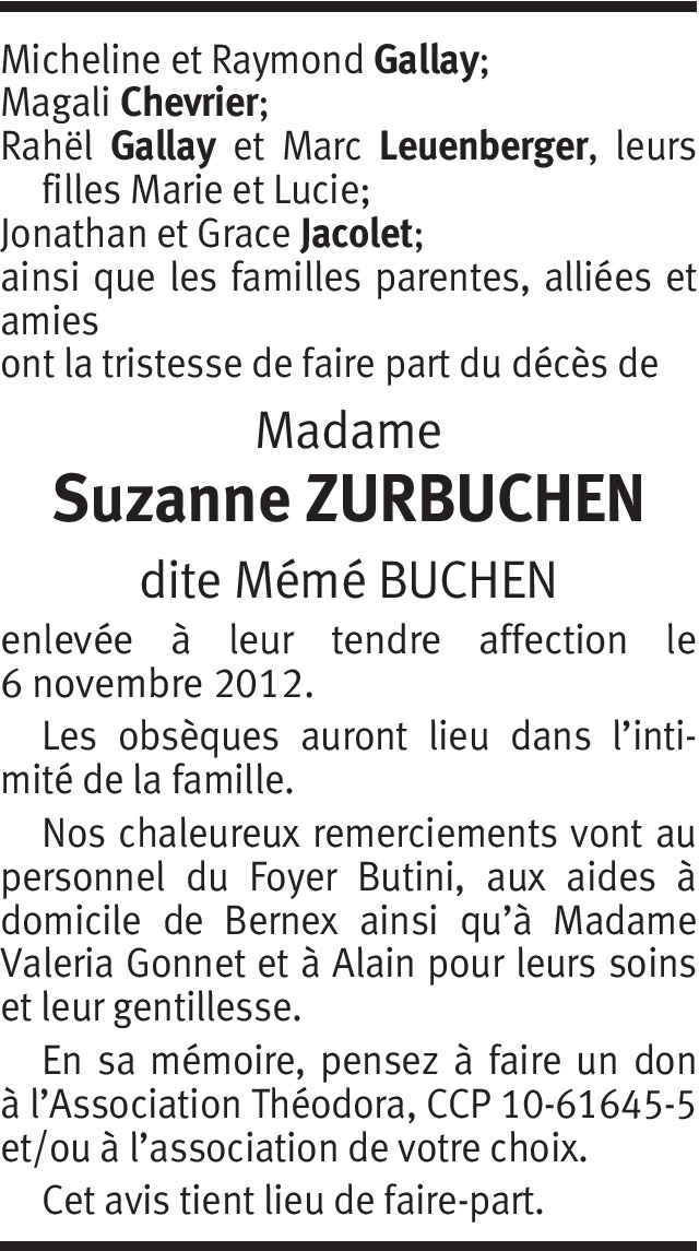 Toutes nos pensées vont vers vous pour le décés de votre maman, belle-maman, grand-maman et arrière grand-maman. Henri, Brigitte, Thierry, Cédric, Romain et Océane vous présentent nos sincères condoléances. Amitié. Fam. Monney