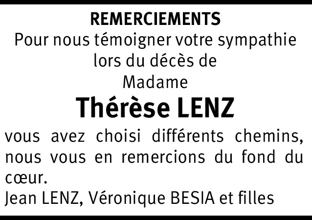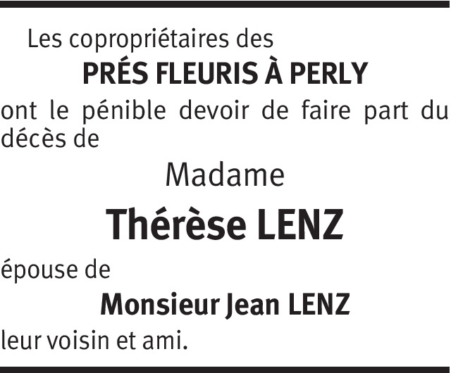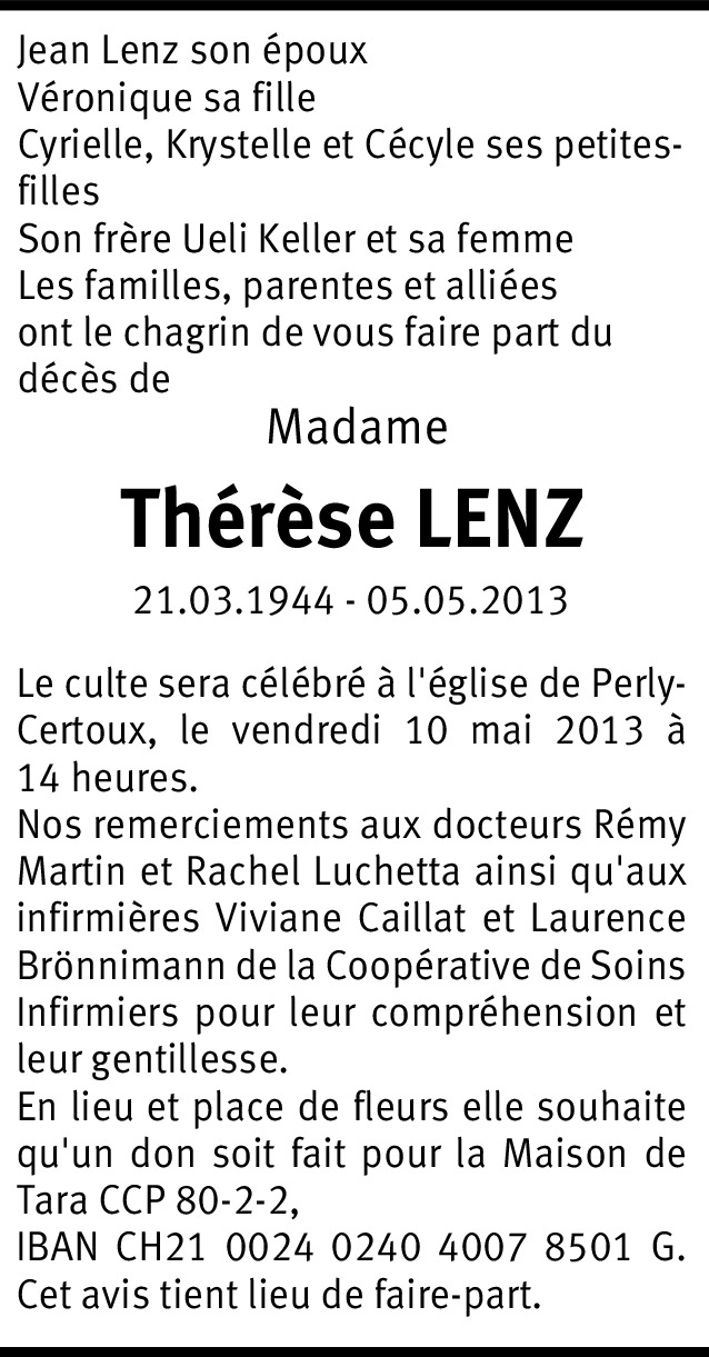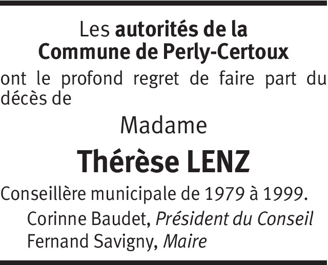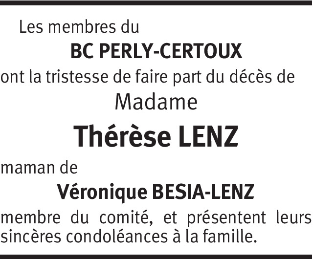Il y a plus de 4 ans Signaler La société de gymnastique de Perly-Certoux à le regret de faire part du décès de Madame Thérèse Lenz mère de leur chère et fidèle monitrice Véronique Besia De la part de Prisca Wasem