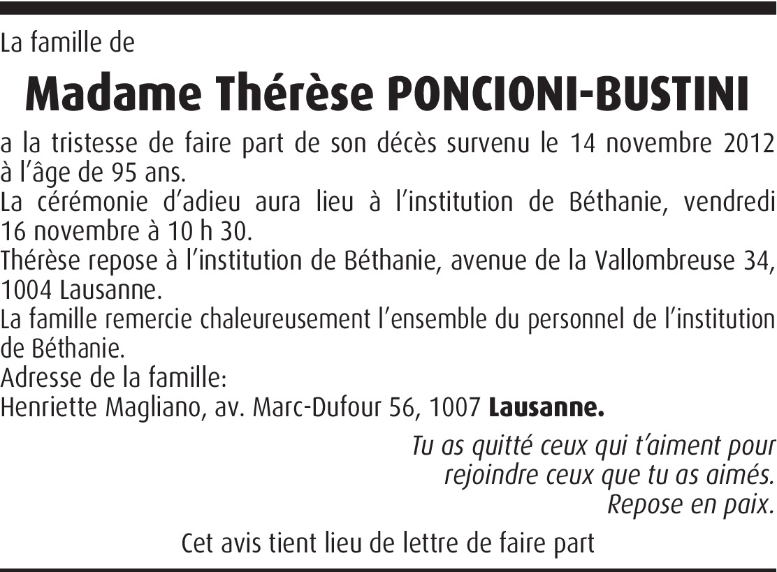 Il y a plus de 4 ans Signaler Se souvenant de la bien-aimée tante Thérèse, nous sommes près à toute la famille dans ce triste moment. Ses neveux Ezio & Eros Poncioni. De la part de Ezio & Eros Poncioni