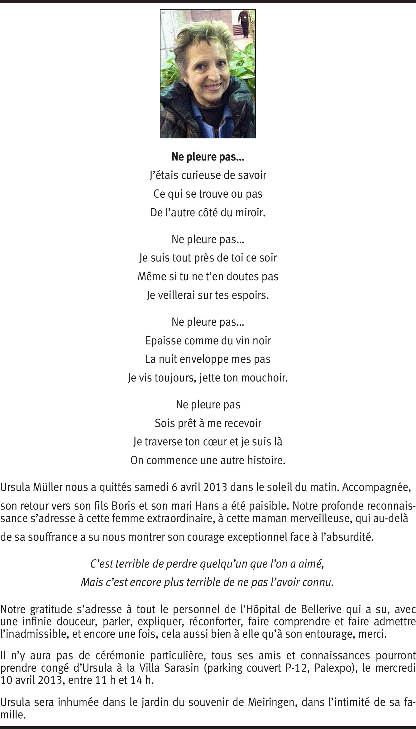 Chère Ursula, quelle courage tu nous a montré tout au long de ta vie, malgré les drames tu avais toujours le sourire, ma chère contemporaine, nous riions ensemble et avec tes collègues : Boumboum, Geno, le "pin's" de plein de choses, nous avons partagés tant de moment aussi bien triste que joyeux, je souhaite de tout mon coeur que tu retrouves ton fils tant aimé, et ton mari, que votre "deuxième vie" soie plus heureuse que la vie terrestre ! Tu étais mon amie, malgré la séparation professionnel, tu es toujours restée dans mon coeur. Que ton dernier voyage soit doux.