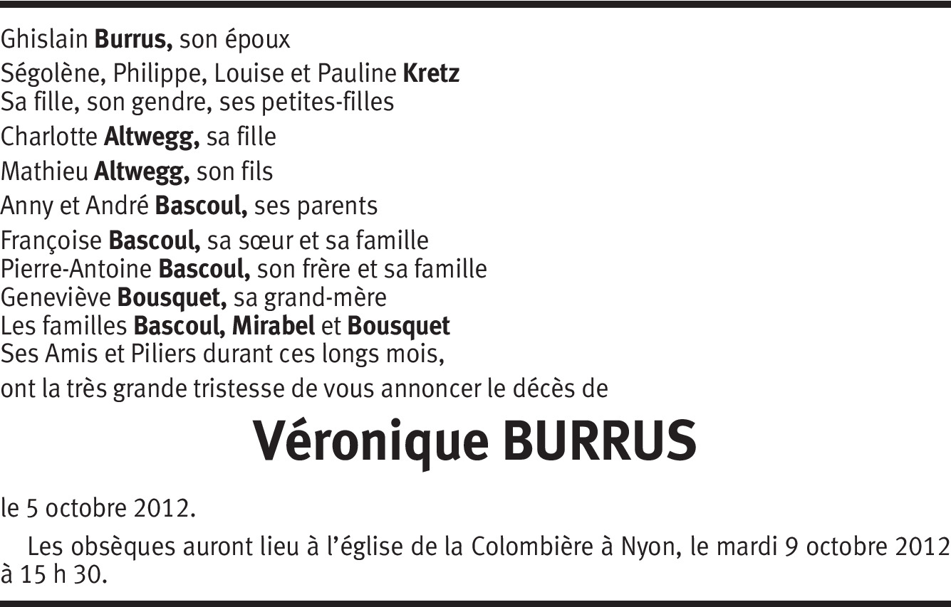 Très triste d'apprendre le départ de Véronique, que j ai connu à Villars avec notre amie France, décédée elle aussi. Trop tôt, tellement trop tôt. Mes sincères condoléances.