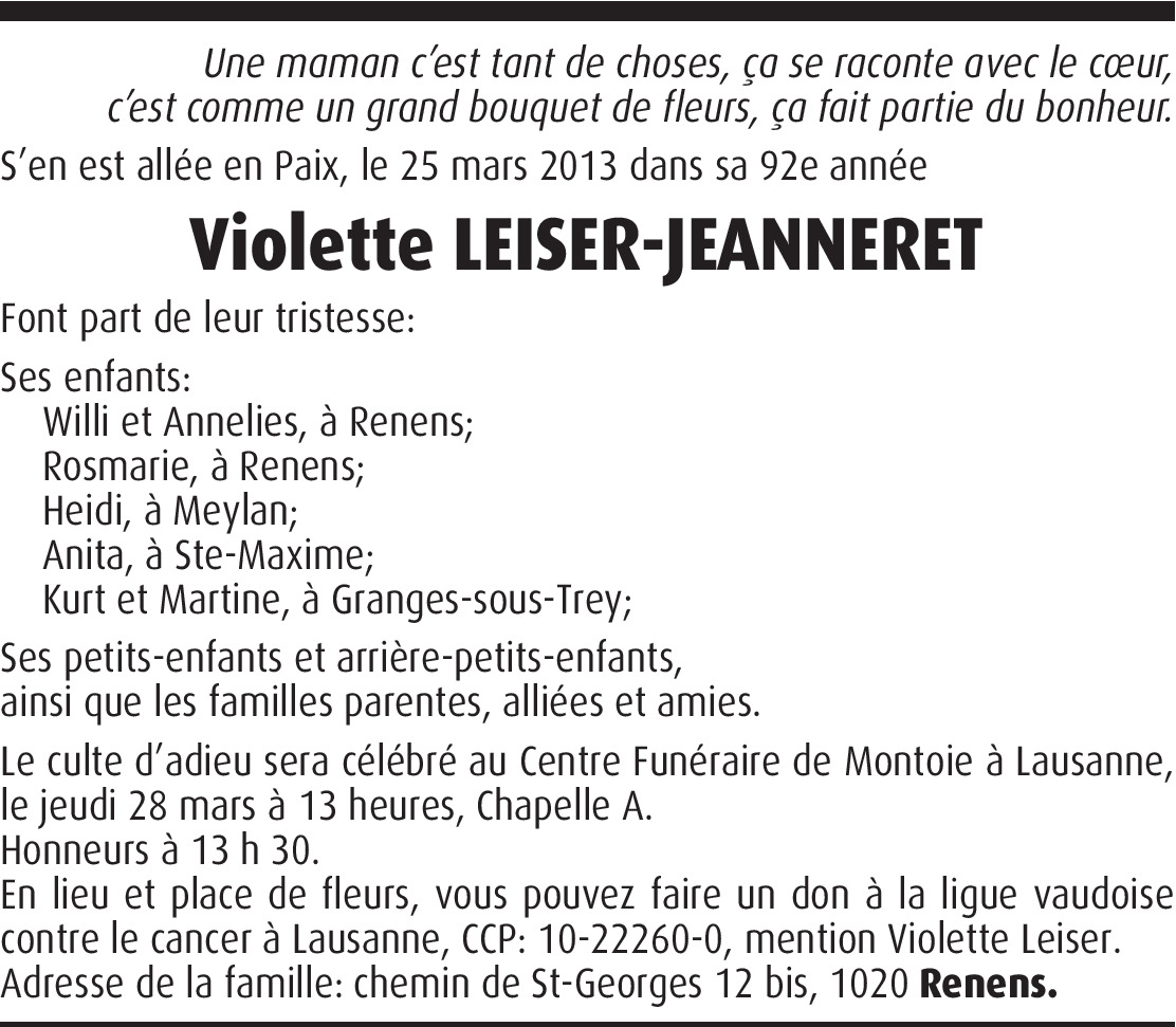 Il y a plus de 4 ans Signaler Touché par l'annonce du décès de votre maman, grand maman, arrière grand maman, nous sommes avec vous dans ces moments pénibles. Toutes nos pensées en ces moments douloureux. Stéphanie et Alexandre Capt. De la part de Alexandre Capt