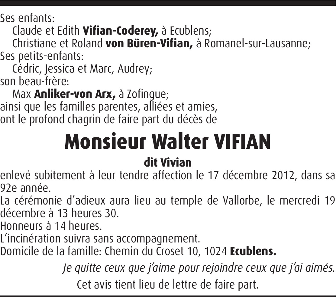 Il y a plus de 4 ans Signaler Attristé par le décès de Monsieur Vifian, je tiens à adresser à sa famille mes plus sincères condoléances. En pensées avec vous. J. Chapuis, Vallorbe De la part de Jacques Chapuis