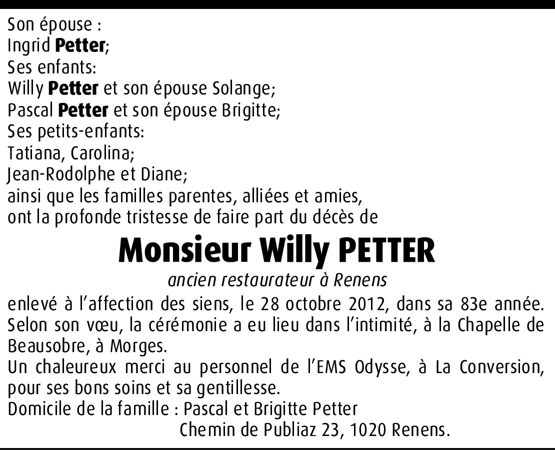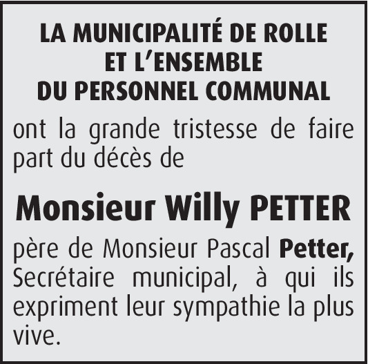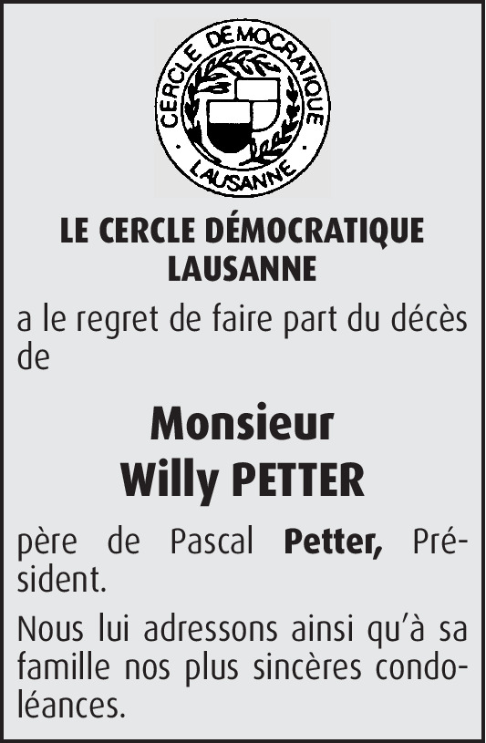 Le comité et les membres de la section vaudoise, de l'Automobile Club de Suisse ont la profonde tristesse de faire part du décès de Monsieur Willy Petter. Père de Monsieur Pascal Petter, Membre du comité et ancien Secrétaire général.