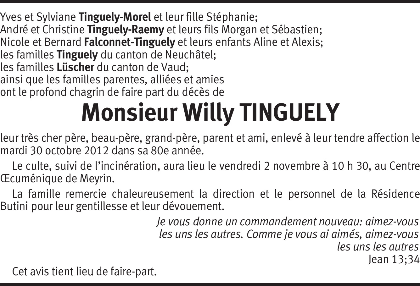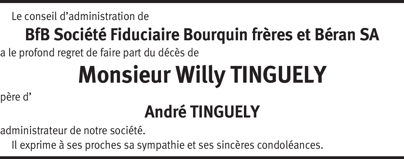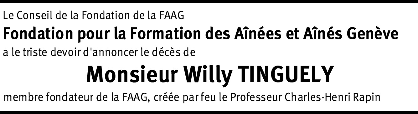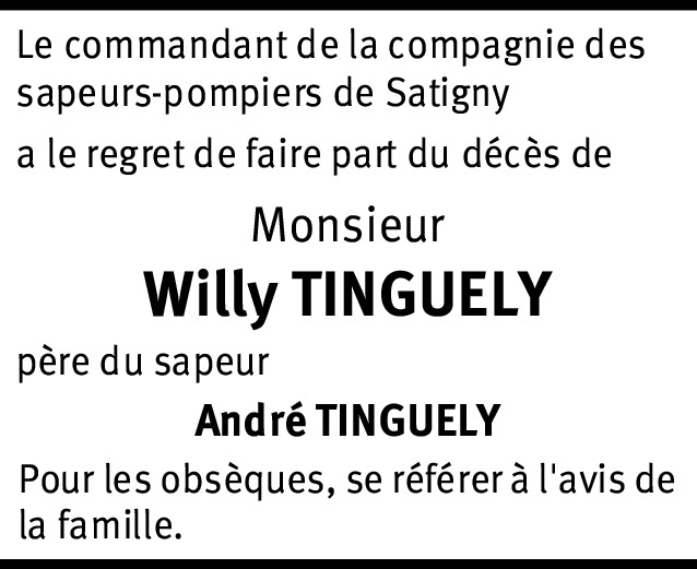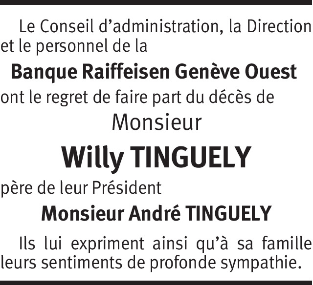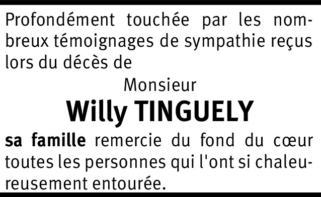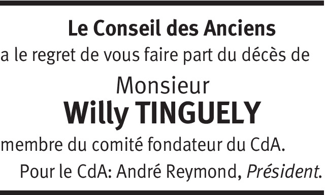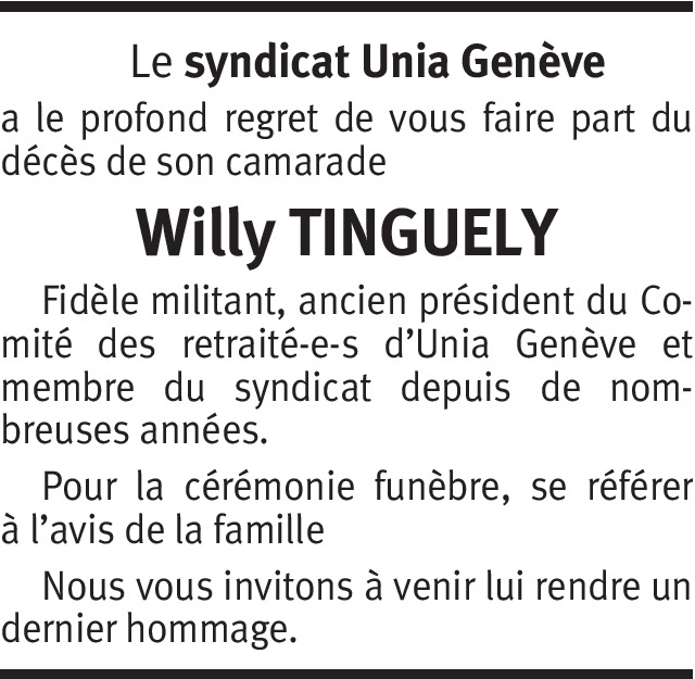 Au nom de la section du Parti Socialiste de Confignon, j'exprime toute notre sympathie à la famille de Willy Tinguely, militant infatigable et membre de notre section depuis plus de 20 ans.