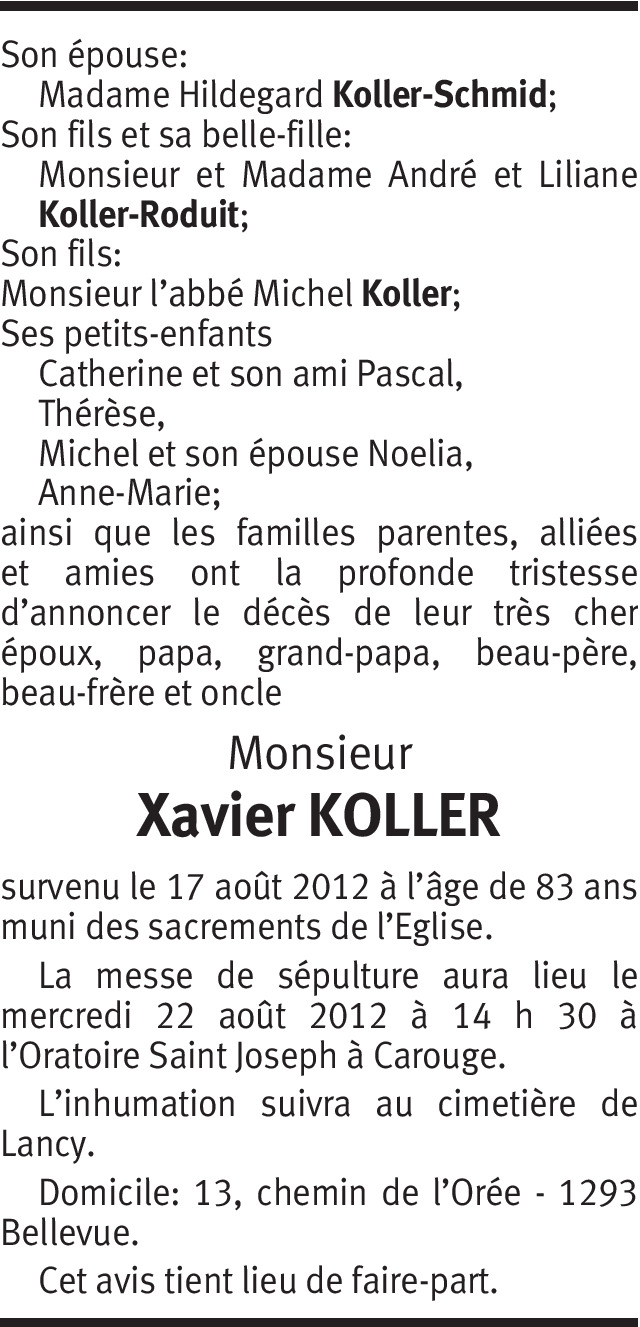 Je garde un très bon souvenir de ce cher mosieur Koller, il a toujours été très agréable envers moi et à maintes reprises aux sorties des messes, il m'accordait d'agréables remarques et félicitations pour l'orgue. Sous son aspect ferme, il cachait un humour et une grande droiture. A sa chère famille, je suis de tout coeur avec vous.