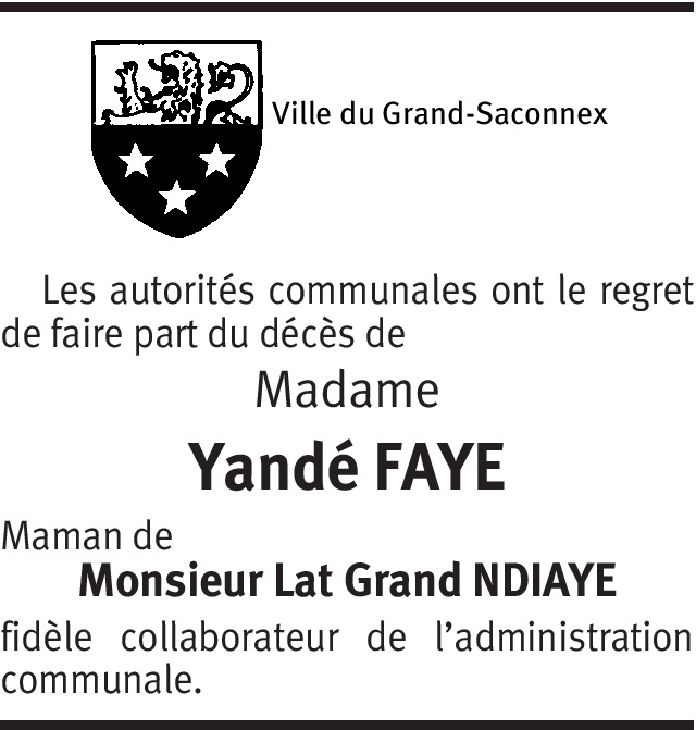 Au nom des beaux-fils de cette dame de cœur qui était une belle-mère, une mère tout court, une conseillère, nous adressons nos vives condoléances à toute sa famille du Sénégal et plus particulièrement à vous qui avait permis à notre beau-frère Monsieur LAT Grand de s’intégrer dans votre communauté d’où l’intérêt que vous lui témoignez en annonçant le décès de notre très chère mère Yandé FAYE dans votre bulletin communal. Merci pour cette élan de compassion.