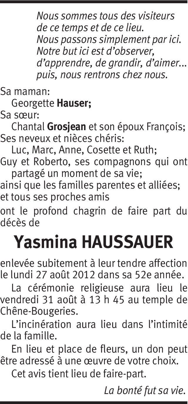 Il y a plus de 4 ans Signaler Je garderai le souvenir d'une collègue attachante et toujours souriante. Échanger quelques mots avec elle était toujours un très agréable moment. Mes plus sincères pensées se dirigent vers tes proches. Repose en paix Yasmina De la part de Christian Conconi